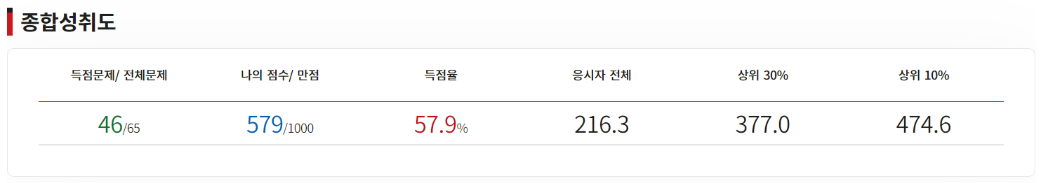 내 점수는 579점이었고, 3수준을 받았다. 회차마다 난이도 편차가 있기 때문에 점수가 동일하더라도 분포가 다를 수 있다. 내가 응시했던 19회에는 579점이라는 점수가 상위 1% 안에 들어가는 점수였다. 교내 1등이어서 총장상도 받았다.
