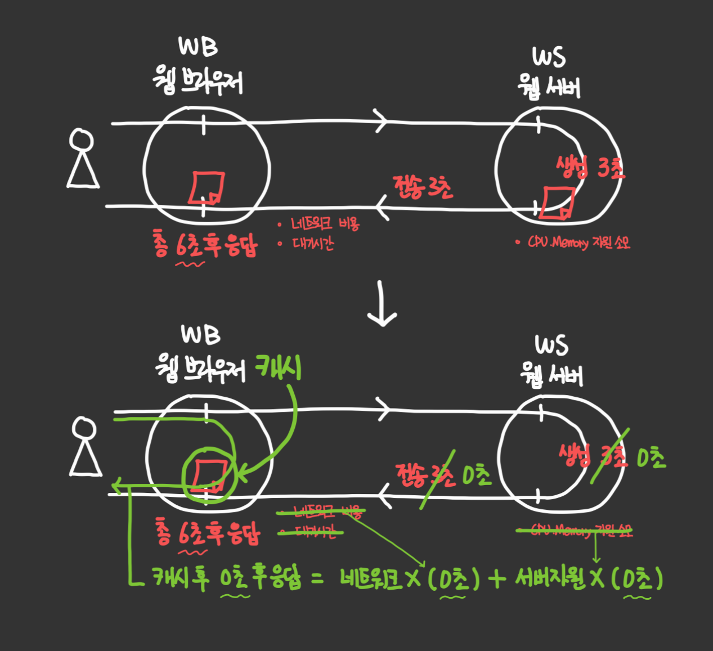 서버에 캐시가 존재하는 경우 => 만드는 시간 0초, 전송 시간 3초