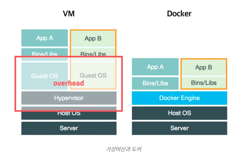- 호스트 OS의 하드웨어 위 동작이기에 적은 오버헤드