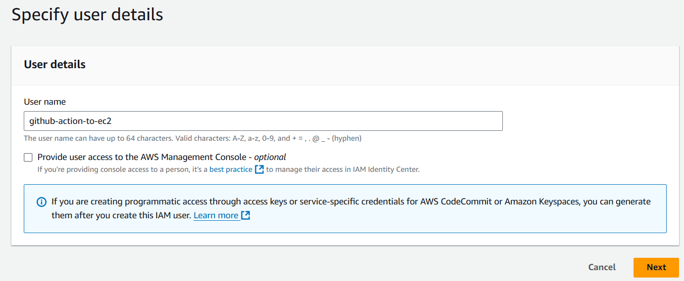 workflow 내에서 보안 그룹에 Github Actions의 IP에 대한 인바운드 규칙을 추가하기 위해서, IAM User를 생성해야 한다.