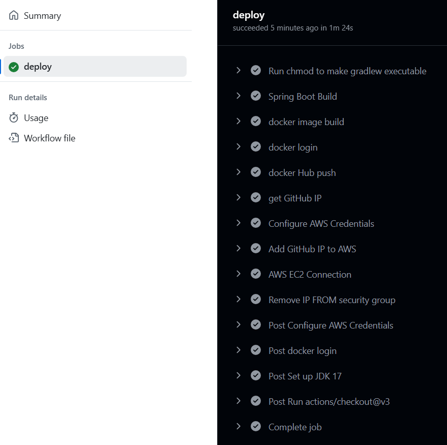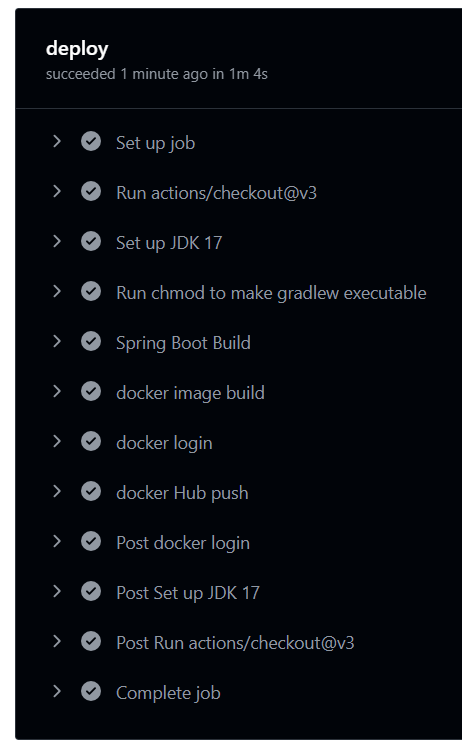 CI / CD workflow 스크립트가 정상적으로 수행 완료되었음을 확인할 수 있다.