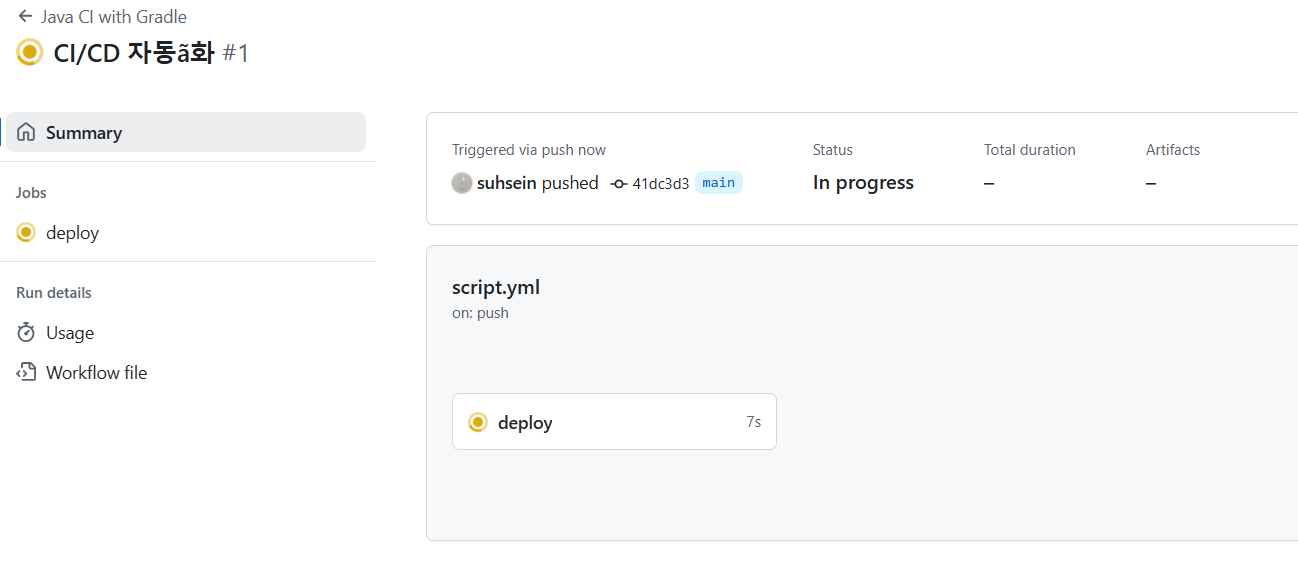 그 후, Github Actions 탭에 들어가면, CI / CD 자동화가 이루어지는 과정을 확인할 수 있다.
