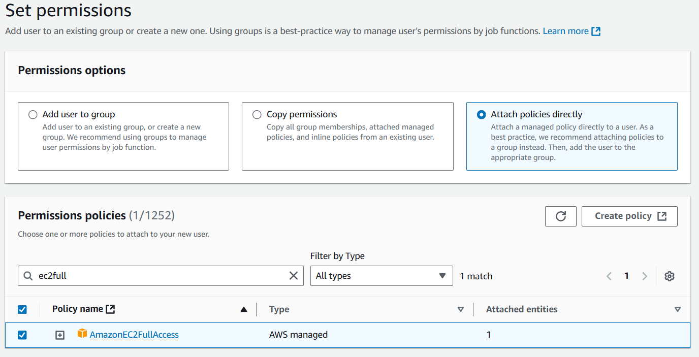 직접 정책 추가를 선택하고, AmazonEC2FullAccess 정책을 추가한다.
