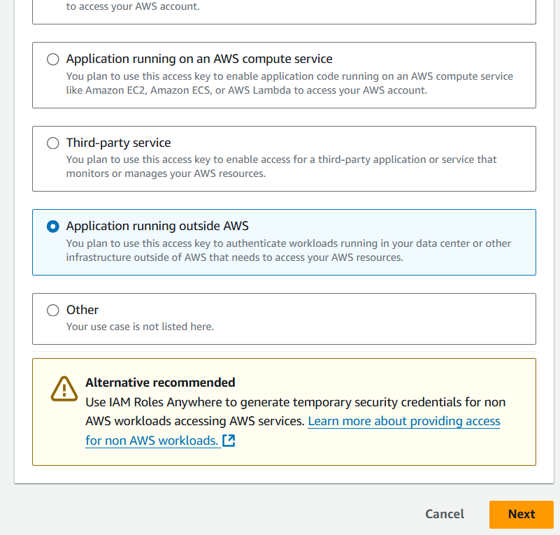AWS 외부에서 실행하는 애플리케이션 (Github Actions의 인스턴스)에서 사용할 것이기 때문에, 해당 메뉴를 선택한다.
